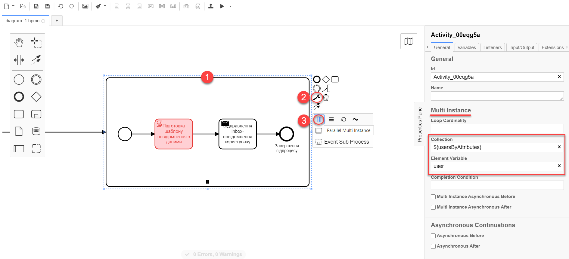 Для відправлення повідомлень багатьом користувачам моделювання бізнес-процесу відбувається за аналогією з моделюванням бізнес-процесу відправки повідомлення одному користувачу, за виключенням використання функції мультиекземпляра (Multi Instance). Ця функція дозволяє виконати одночасне відправлення повідомлень усім зазначеним користувачам із масиву.