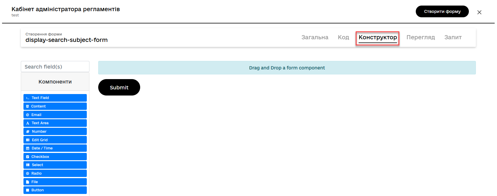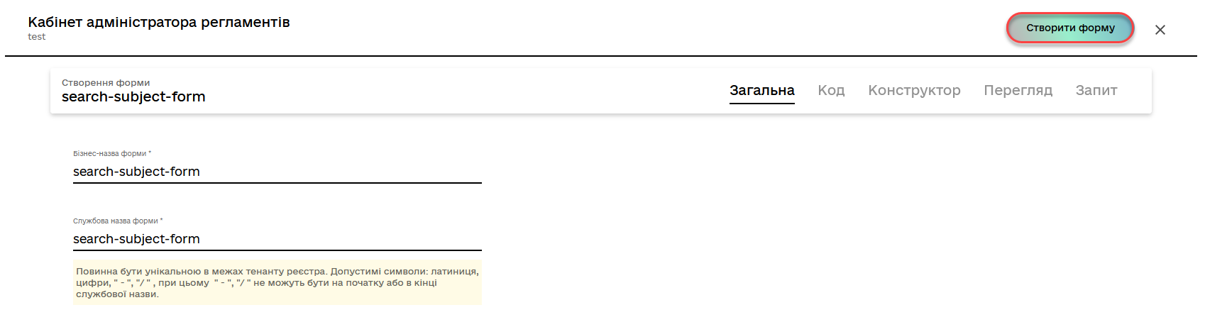 Службова назва формизначеннямdisplay-search-subject-form(має відповідати значенню поляForm keyтієї ж користувацької задачі —Відображення інформації за суб’єктом у ЄДР(task2).