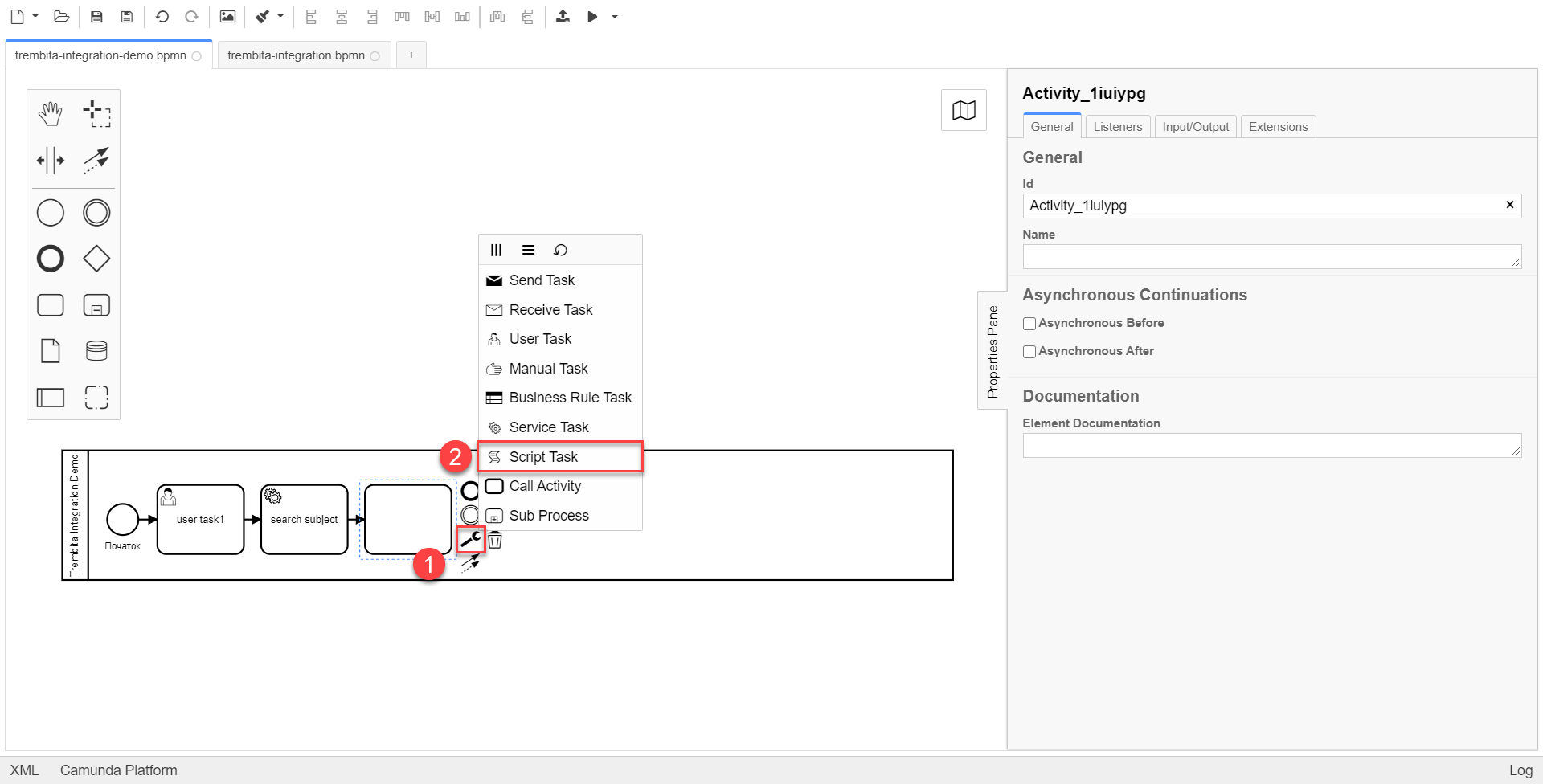 На етапі моделювання бізнес-процесу необхідно створити та зберегти відповідну BPMN-діаграму. Використовуйте файл trembita-integration.bpmn із готовою схемою бізнес-процесу як приклад. |