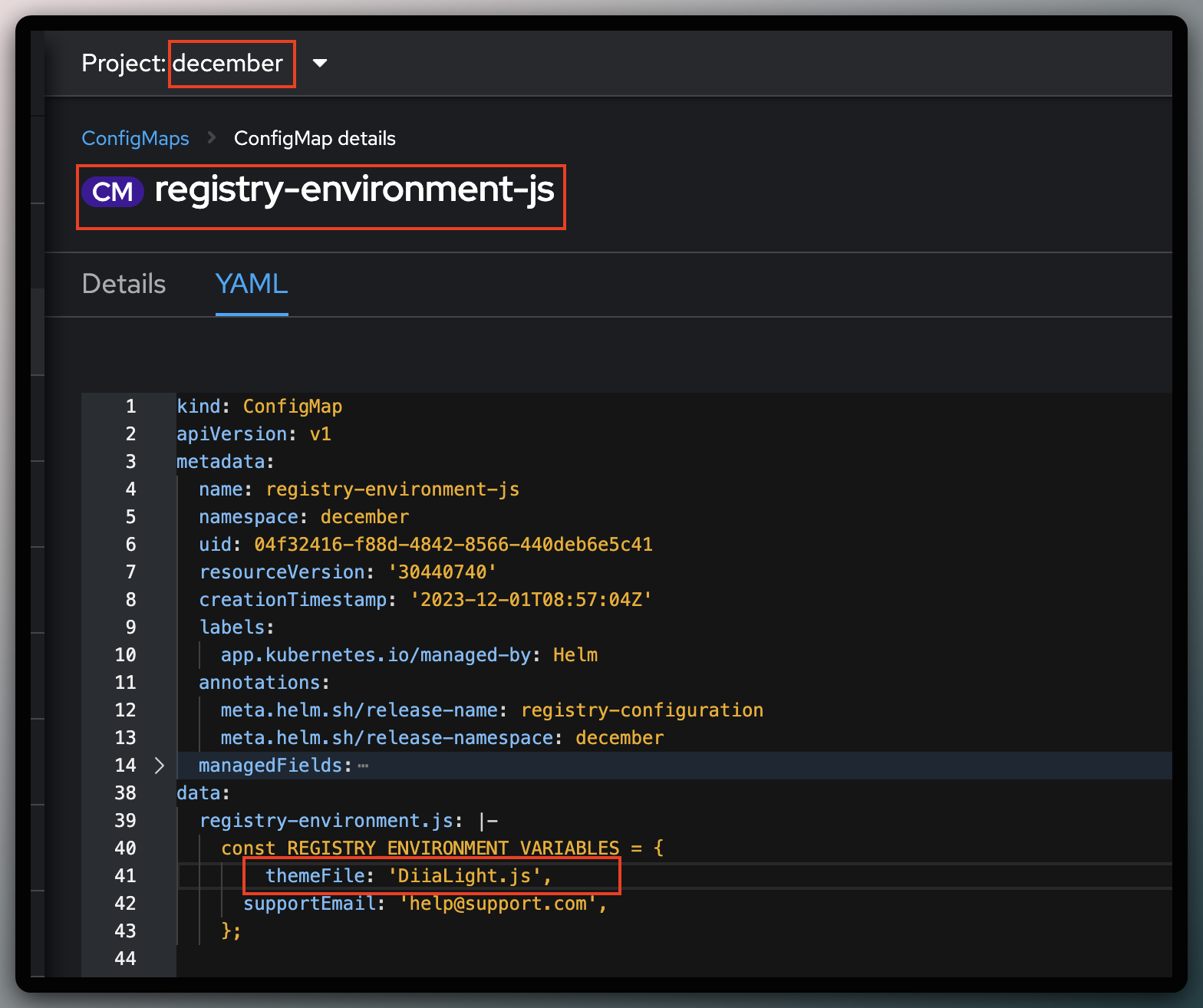 Відрийте OpenShift-консоль, оберіть проєкт з реєстром та змініть конфігурацію теми. Для цього знайдіть ConfigMap